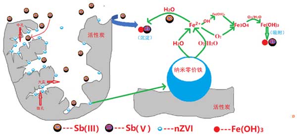 氧氣對銻(III)的氧化非常緩慢。然而,有人聲稱當零價鐵被氧氣腐蝕時,會產生強氧化劑,可以氧化各種有機和無機分子。在酸性條件下,兩個電子從鐵離子表面轉移到氧,產生過氧化氫。在低pH值下,過氧化氫與鐵離子的相互作用形成羥基自由基(OH-),而在pH值超過5.0時,它通過反應生成鐵(IV)。我們之前的研究發現活性炭對砷(III)的氧化影響比較大。這是因為活性炭表面富含官能團,當砷(III)擴散吸附在活性炭表面時,這些官能團被氧化。此外,因為銻(III)比砷(III)氧化得更快,所以銻(III)可以被活性炭快速氧化。在沒有弱磁場的情況下,零價鐵介導的銻(III)去除通常由兩個時間段組成。基于上述結果和討論,銻(III)的去除是一個復雜的過程,包括表面吸附和氧化。圖3描繪了銻(III)去除的機制。