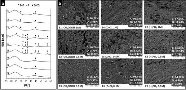活性炭的X射線衍射圖如圖1-a所示。峰值在2θ=44在所有衍射圖中觀察到的6°歸因于對(duì)應(yīng)于石墨(00-001-0646)的(101)平面。與其他材料不同,活性炭的衍射圖也顯示在2θ=26.4°歸因于石墨(00-001-0646)的(002)平面。ZnO和CaCO3可能是在熱處理過(guò)程中作為原材料組分和活化劑之間二次化學(xué)反應(yīng)的產(chǎn)物或由于前體中固有的殘留礦物質(zhì)含量而產(chǎn)生的。經(jīng)過(guò)掃描電鏡分析500倍的SEM顯微照片如圖1-b所示。觀察到所有活性炭都表現(xiàn)出異質(zhì)表面形態(tài),其由不規(guī)則形式的成組薄片組成。在用ZnCl2活化的碳的表面上觀察到與氧化鋅相對(duì)應(yīng)的沒(méi)有特定形狀的白色小顆粒(通過(guò)XRPD分析證實(shí))。此外,EDS分析顯示存在分散在整個(gè)表面的碳(C)、氧(O)和鋅(Zn),從而證實(shí)了ZnO顆粒分散在這些吸附劑的表面上。