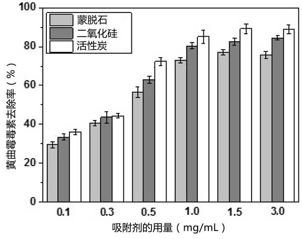 三種吸附劑對AFB1的吸附在25℃下進行24小時。圖1顯示了活性炭和其它吸附劑用量的AFB1去除率。無論吸附劑劑量如何,使用活性炭時去除率更高,其次是二氧化硅和天然蒙脫石。正如預(yù)期的那樣,AFB1的去除率隨著吸附劑劑量的增加而增加,這可以通過AFB1與吸附劑之間的相互作用增加來解釋,包括氫鍵、孔填充和靜電吸引力。吸附劑量為1.0mg/mL時,黃曲霉毒素的去除率使用蒙脫石、二氧化硅和活性炭時,分別為73.23%、80.35%和85.09%。在較高的吸附劑量(1.5mg/mL)下,去除率分別略微增加至75.56%、83.48%和89.15%。在這個吸附系統(tǒng)中,當(dāng)吸附劑以較低濃度使用時,可用的吸附位點較少。因此,增加吸附劑濃度有效地增加了吸附位點的數(shù)量,從而提高了AFB1的去除率。但濃度過高時,吸附劑顆粒間會發(fā)生膠結(jié)、絮凝和團聚現(xiàn)象。這導(dǎo)致可用吸附位點的數(shù)量穩(wěn)定或減少,并且去除率沒有進一步提高。此外,當(dāng)吸收劑以高濃度使用時,可能會消除維生素E和甾醇等微量營養(yǎng)素,從而導(dǎo)致營養(yǎng)流失。因此,使用濃度為1.0mg/mL的吸附劑被認(rèn)為是合適的,因此在進一步的實驗中被采用。