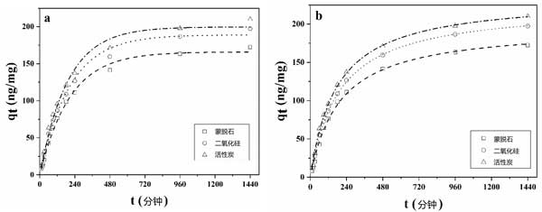 圖2:(a)黃曲霉毒素在活性炭和其它吸附劑上吸附的擬一級動力學(xué)模型擬合曲線和(b)擬二級動力學(xué)模型擬合曲線。
