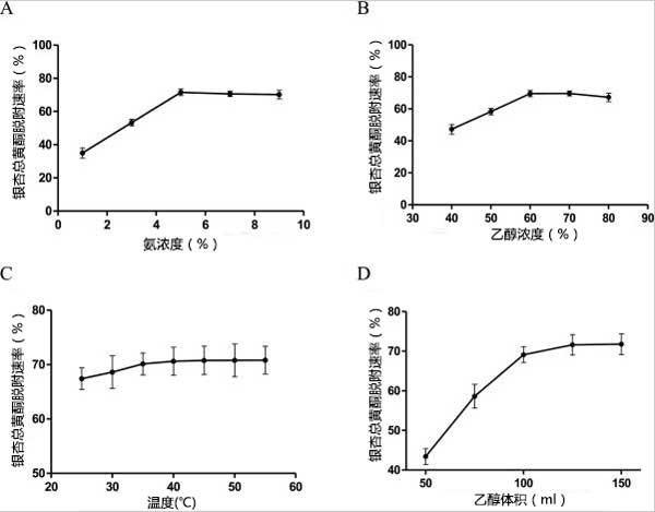 活性炭對銀杏葉中銀杏總黃酮的吸附主要依靠分子間范德華力的可逆吸附和表面酸性氧化物的不可逆吸附,兩者在吸附極性化合物方面均優于非極性化合物。銀杏總黃酮的解吸方法主要有升溫解吸(沸水)、置換解吸(苯酚、氨水或CaCl2)和超聲波解吸。沸水對銀杏總黃酮的穩定性影響很大,氨水的效果與幾種去污劑相比效果顯著。因此,本研究將通過單因素優化相關因素。單因素優化比較了三種拆分劑(苯酚、氨水或CaCl2)對活性炭中銀杏總黃酮拆分的影響,其中氨水的影響最為顯著。因此,我們比較了不同濃度氨對活性炭解析的洗脫速率,氨濃度在5%時達到最大值,超過5%后逐漸下降。由于黃酮類化合物的極性范圍較寬,在大約5%的氨-乙醇-水溶液中可以實現銀杏總黃酮的最大解吸率(71.2%)。