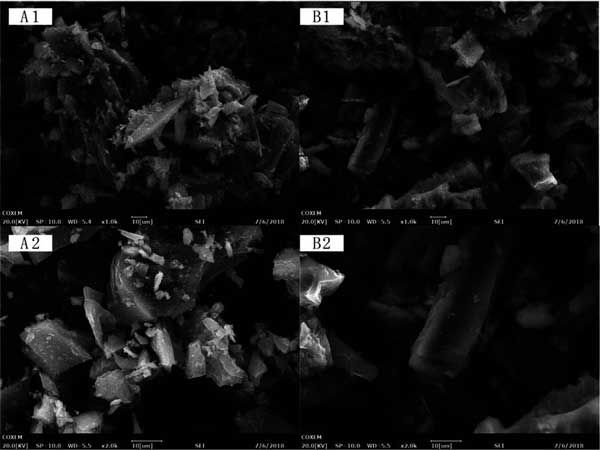 圖3:被活性炭吸附和解吸的銀杏總黃酮的SEM。A1和A2是洗脫前不同放大倍數的SEM照片。B1和B2為洗脫后不同倍率的SEM照片。