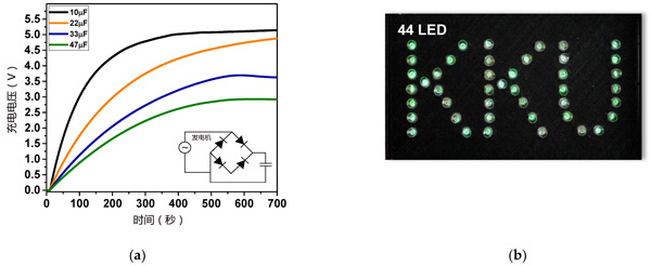 圖3:(a)由活性炭制造的摩擦納米發(fā)電機(jī)產(chǎn)生的電力充電的電容器的充電電壓曲線(xiàn)(b)發(fā)電機(jī)電輸出可瞬間點(diǎn)亮44個(gè)綠色LED。