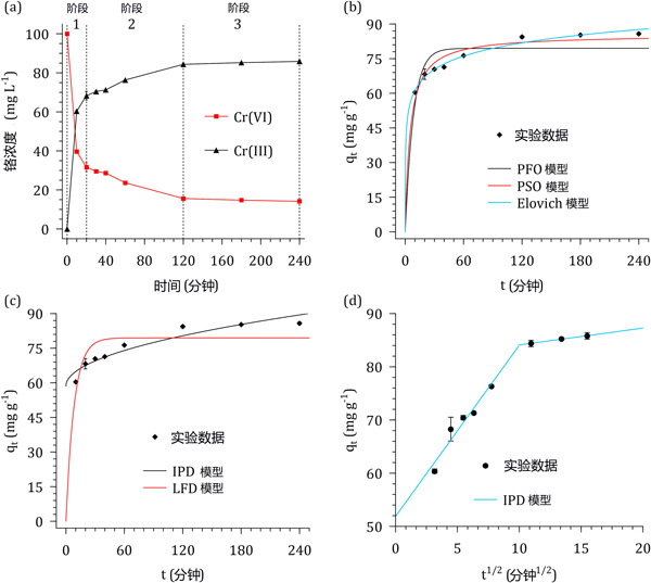 圖2:(a)六價鉻溶液和浸漬活性炭接觸時間對Cr濃度和形態的影響。(b)反應動力學模型、(c)擴散模型和(d)線性化的顆粒內擴散模型。