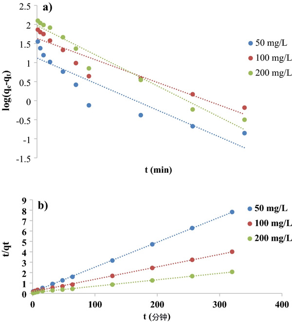 圖3:( a )活性炭吸附高錳酸鉀的一級(jí)動(dòng)力學(xué)模型和( b ) 二級(jí)動(dòng)力學(xué)模型。