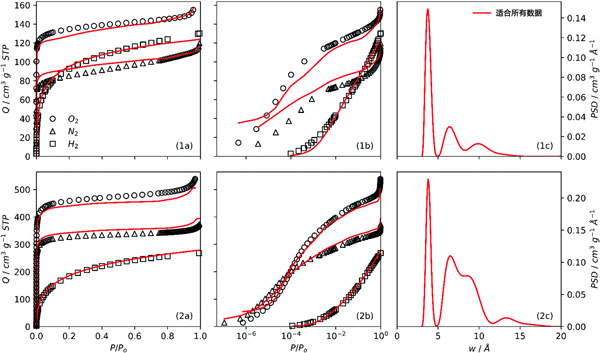 圖2:擬合樣品活性炭的N2/H2(1a,1b,1c)和O2/H2(2a,2b,2c)等溫線和所得的PSD(1P,2P)。