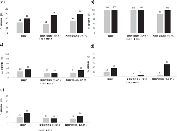 使用帶有攪拌的恒溫浴用于浸出測試,該測試在90℃和250rpm下在250mL硼硅酸鹽玻璃罐中使用H2SO4溶液(在pH值1)濃度為5gL-1的Fe(III)。在浸出過程中控制溫度(90℃)和攪拌速度(250rpm),直到48和96小時。浸出劑溶液的Eh為547mV。硫酸的純度和硫酸鐵(III)分別為97%和99.5%。在每個實驗中,在硼硅酸鹽玻璃罐中稱量2.5g。除對照外,活性炭比為1/0.5和1/0.25。然后,加入50mL浸出劑。使用兩個反應(yīng)時間對每種活性炭混合物進行兩次浸出實驗:第一次直到48小時,第二次直到96小時。在浸出實驗期間,每24小時打開一次罐子,以確保浸出系統(tǒng)有足夠的氧合。在反應(yīng)結(jié)束時(48小時和96小時),將紙漿過濾并用50mL/H2SO4洗滌兩次pH2的溶液以回收吸附在活性炭表面上的金屬。通過測定浸出和洗滌溶液中的Cu、Zn、As、Co和Sb的含量。