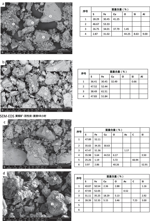 在浸出殘渣中發(fā)現(xiàn)的其他礦物種類是黃銅礦、黃鐵礦、閃鋅礦和石英。氧化還原電位必須足夠低才能形成Cu2S,而黃鉀鐵礬沉淀在非常高的氧化還原電位下更受青睞。通過SEM-EDS對初始活性炭樣品(圖3a)和浸出殘留物(圖3b和3c)的分析表明存在黃銅礦、黃鐵礦和初始精礦中的小石英顆粒。浸出48小時后(圖3b),固體殘留物顯示存在黃銅礦,表面因浸出而改變黃鐵礦。對活性炭浸出48小時后獲得的殘留物的分析表明存在黃鐵礦、吸附硫的碳,并且一些黃銅礦顆粒發(fā)生了很大的變化,表明從黃銅礦中優(yōu)先浸出Fe而不是Cu。