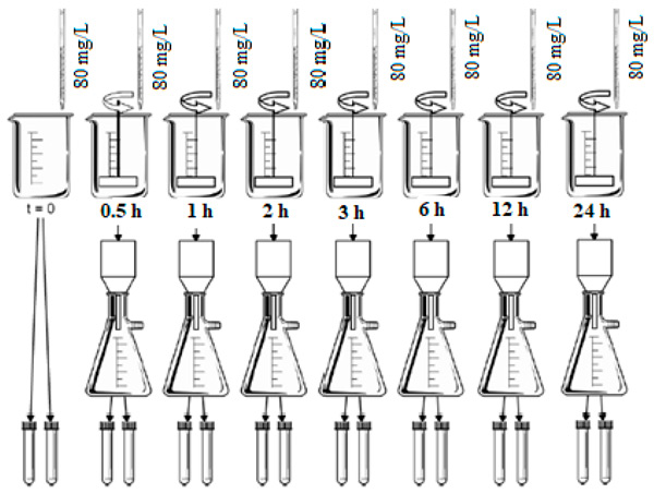 測定平衡時(shí)間的吸附試驗(yàn)對(duì)每種活性炭進(jìn)行兩次。使用了7個(gè)裝有500mL研究水的1L燒杯。每個(gè)燒杯接受一份活性炭懸浮液,以在水研究中獲得80mg/L的初始濃度。將燒杯放在一個(gè)罐子測試設(shè)備中,將混合速度保持在205rpm在恒溫23℃的環(huán)境中。采用的接觸時(shí)間為0.5、1、2、3、6、12和24小時(shí)。接觸時(shí)間后,將每個(gè)燒杯從攪拌中取出,立即通過孔徑為0.22μm的纖維素酯膜過濾研究水,以分離碳并中斷吸附過程。分析過濾后的水餾分的pH值和柱狀藻紅濃度。圖1顯示了平衡時(shí)間測定分析中評(píng)估的條件的示意圖。