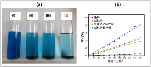 圖3:(a)過(guò)濾可見(jiàn)光照射5小時(shí)后MB溶液的照片。(i)單獨(dú)的MB,(ii)MB與活性炭,(iii)MB與官能團(tuán)化活性炭,和(iv)MB與活性炭載卟啉,(b)亞甲藍(lán)降解的動(dòng)力學(xué)線(xiàn)性模擬曲線(xiàn)。