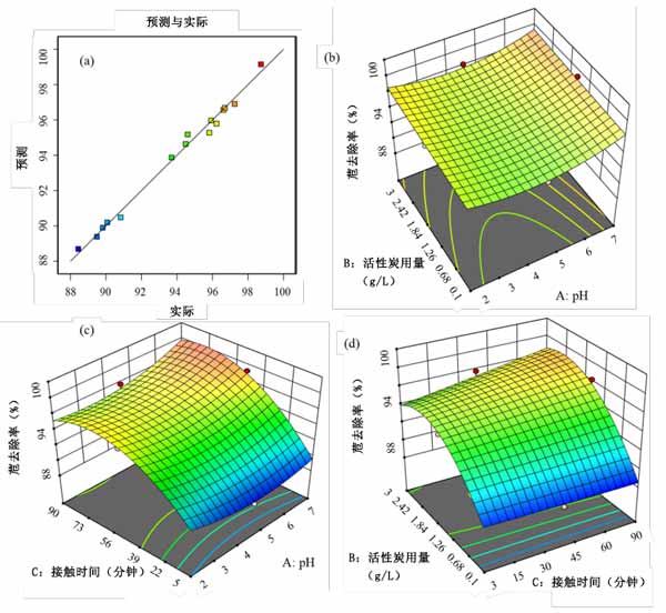 圖2:(a)預測的乙腈去除量與實際去除量的關系圖,(b)乙腈去除量的pH值與活性炭用量的3D圖,(c)乙腈去除量的pH值與接觸時間的3D圖,(d)3D圖接觸時間與活性炭用量的苊去除圖。