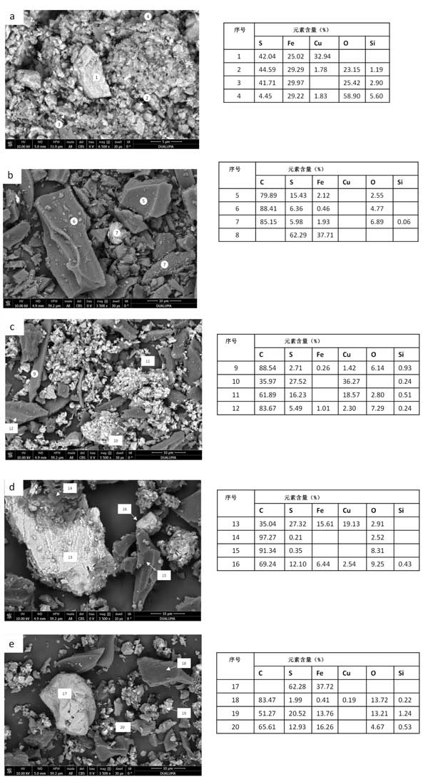 最終殘留物的SEM-EDS圖像在圖2顯示,并證實了通過XRD獲得的結果。圖2a顯示了礦物浸出后固體殘渣的SEM圖像。可以觀察到大的黃銅礦顆粒的存在(點1),黃鐵礦的小顆粒具有不同的氧化礦物(點2、3和4)。樣品活性炭浸出后的固體殘留物圖像(圖2b)顯示活性炭的存在,其表面具有硫原子和一些Fe(點5、6和7)和黃鐵礦(點8)。沒有觀察到銅的存在,這與其高提取值(99.1%)一致。圖2c顯示了樣品活性炭1:0.25浸出后獲得的固體殘留物的圖像。在活性炭的表面上可以觀察到硫和銅的存在,可能是由于CuS(點9-12)。用生物炭浸出礦物后的固體殘渣分析見圖2d(比例1:1)和(比例1:0.25)。根據XRD分析,有黃銅礦顆粒(點13)類似于沒有生物炭的礦物浸出的固體殘渣。與添加活性炭相比,生物炭顆粒的表面硫含量較低(點14和15),表明生物炭吸附能力較低,這與生物炭的較低表面積一致。生物炭表面上存在的一些硫可能是由于與浸出劑的反應和硫物質的低吸附性。最后,觀察到不同礦物的聚集體(第16點)。關于生物炭比例為1:0.25的固體殘留物,黃鐵礦的存在(第17點),生物炭與少量S、Cu和Fe結合(第18點),可以觀察到不同礦物和碳顆粒的小顆粒混合物(第19點和第20點)。