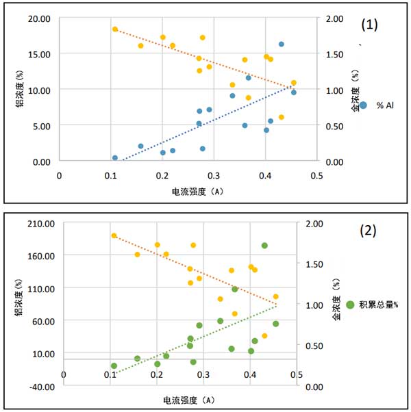 圖3:電流強度與鋁和金濃度(1)的關(guān)系圖,以及電流強度與總累積重量和金濃度(2)的關(guān)系圖。