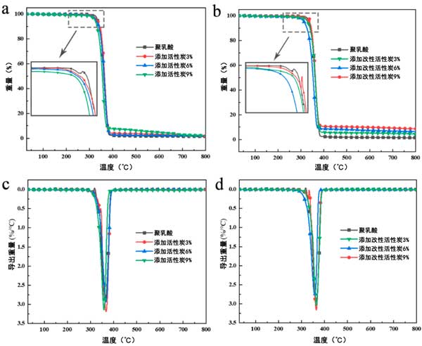 熱重分析結果列于圖3中。所有樣品均呈現單一熱降解階段,但5%質量損失溫度(T5%)或熱降解速率最高溫度(Tmax)略有不同。純聚乳酸在322℃時開始快速降解,如圖3a所示,其Tmax達到363℃,并且在400℃時幾乎所有質量都損失了。在800℃的終端溫度下測得相應的殘炭率僅為1.35%。相比之下,當應用改性活性炭時,酸性添加劑(磷酸鹽)會促進聚乳酸復合材料的較早分解,這與之前的結果一致。殘炭率隨著復合材料中改性活性炭的加載而逐漸增加。純聚乳酸和改性活性炭復合材料的Tmax幾乎沒有差異,分別為363℃、364℃、357℃和363℃。因此可以看出,改性活性炭負載對聚乳酸降解沒有影響。在600℃到800℃的范圍內,聚乳酸燃燒的殘余物沒有質量變化,但在一定程度上可以觀察到輕微的質量損失,表明加入改性活性炭后復合材料的燃燒延遲。
