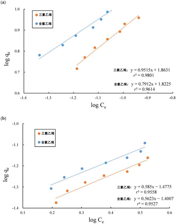 圖3:(a)活性炭和(b)硅膠吸附到氯代有機化合物上的實驗數據,符合Freundlich等溫線的線性形式。