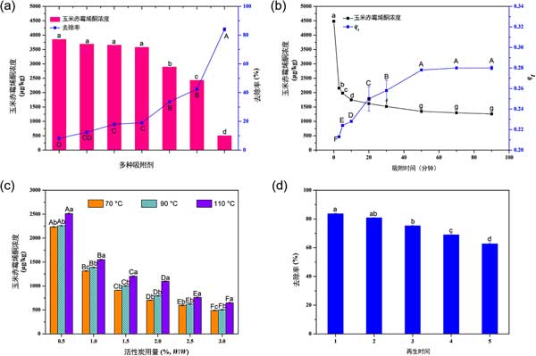 圖1:不同工業(yè)吸附劑(a)、吸附時(shí)間(b)、活性炭用量和吸附溫度(c)以及活性炭再生穩(wěn)定性(d)對玉米赤霉烯酮嚴(yán)重污染的玉米油中玉米赤霉烯酮去除的影響。