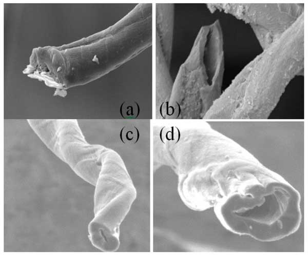 通過煅燒和HNO3、H2O2和KOH活化,廢棉纖維成功轉(zhuǎn)化為不同結(jié)構(gòu)的活性炭。圖1顯示了三種活性炭的SEM圖像。可以看出,化學活化有助于大孔隙的形成。在整個纖維長度上可以觀察到一個空心芯,直徑約為0.5–5.0µM,形狀幾乎為圓形。活性炭具有高度多孔的結(jié)構(gòu),核心直徑在大約0.5和5μM之間(圖1b,d)。這種大孔隙率可能與纖維內(nèi)壁木質(zhì)素的化學破壞有關(guān)。參考活性炭(圖1a)呈現(xiàn)大孔隙,而形態(tài)特征是纖維中芯的出現(xiàn),其直徑取決于活化劑。使用過氧化氫作為活化試劑獲得最大直徑(圖1b)。如圖1b-d所示,前體的結(jié)構(gòu)(最初具有干凈的表面)在每次化學處理后都會被破壞。有趣的是,其中一種活性炭的表面在化學活化的影響下發(fā)生明顯變化(與其他活性炭相比)。