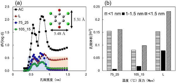 圖3:(a)使用DFT和二氧化碳吸附/解吸方法計算的微孔尺寸分布。(b)CHL浸漬活性炭的孔體積。