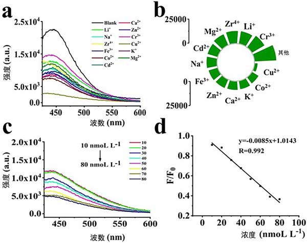 納米活性炭點(diǎn)對金屬離子的選擇性至關(guān)重要,添加納米活性炭點(diǎn)后檢查金屬離子的熒光強(qiáng)度。當(dāng)將納米活性炭點(diǎn)添加到空白溶液和含有12種金屬離子的溶液中時,發(fā)生熒光發(fā)射,如圖2a和b所示。然而,當(dāng)添加Cu2+時,納米活性炭點(diǎn)的熒光強(qiáng)度明顯下降,熒光強(qiáng)度下降了87.1%,表明發(fā)生了明顯的熒光猝滅。隨著Cu2+濃度從10nM增加到80nM,納米活性炭點(diǎn)的熒光強(qiáng)度隨著Cu2+濃度的增加而降低,如圖2c所示。線性相關(guān)系數(shù)(r)為0.992(圖2d)。檢測限(LOD)計算為3r/S,其中r代表空白信號標(biāo)準(zhǔn)偏差(n=11),n指對空白樣品進(jìn)行重復(fù)測量的次數(shù),S(指斜率)的線性曲線)。因此,Cu2+的納米活性炭點(diǎn)的LOD計算為2.83nmol/L-1。一些報道的材料可以同時檢測兩種或多種金屬離子。例如,摻雜氮和硫制備的基于羊毛角蛋白的熒光CQD可以檢測Cr6+和Fe3+。相比之下,鴿糞合成的氮硫共摻雜熒光納米活性炭點(diǎn)可以檢測Hg2+和Fe3+。在我們的案例中,納米活性炭點(diǎn)對Cu2+的檢測表現(xiàn)出高選擇性。納米活性炭點(diǎn)的表面有機(jī)基團(tuán)(-COOH和-NH2)具有很強(qiáng)的選擇性與Cu2+結(jié)合的能力,導(dǎo)致納米活性炭點(diǎn)聚集,產(chǎn)生較高的猝滅熒光強(qiáng)度,從而導(dǎo)致納米活性炭點(diǎn)的熒光強(qiáng)度猝滅。當(dāng)Cu2+濃度在10至80nM范圍內(nèi)時,熒光強(qiáng)度表現(xiàn)出良好的線性相關(guān)性,如圖2d所示。