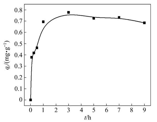 用100mL硫代硫酸銅溶液進行銅吸附動力學試驗,初始銅濃度為3g/L。硫代硫酸鹽與銅的摩爾比為8:1。除另有說明外,0.5g活性炭用于吸附試驗。圖2顯示了Cu(S2O3)23−在活性炭上的吸附動力學。活性炭對銅的吸附容量在前1h急劇增加,隨后略有下降并趨于穩定。