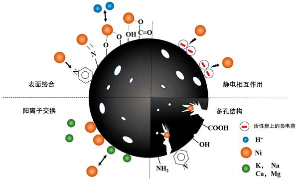 活性炭改性后高效去除廢水中的鎳,用了一種新的改性方法來制備活性炭。改性劑為硫酸四氨合銅(II)一水合物([Cu(NH3)4]SO4·H2O)。活性炭通過吸附有效去除水中的Ni(II)。與未改性的活性炭相比,活性炭的改性導致比表面積和總孔體積降低,而改性導致比表面積和總孔體積增加氧和氮的存在,表明含O和含N官能團的結(jié)合。改性活性炭相對于活性炭表現(xiàn)出優(yōu)異的吸附能力。值得注意的是,改性活性炭表現(xiàn)出強大的緩沖能力和對pH變化的適應性。Ni(II)在活性炭上的吸附機制包括表面絡合、陽離子交換和靜電相互作用。本研究概述了一種經(jīng)濟有效的方法來制備用于吸附廢水中Ni(II)的活性炭,并闡明了潛在的吸附機制。
