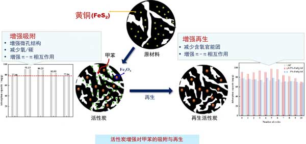 研究發現,添加0.5%的黃鐵礦能顯著提升活性炭的甲苯吸附能力和再生穩定性。與未改性活性炭相比,改性后的活性炭甲苯吸附容量增加了17.64%,且在五個再生循環后仍能保持超過77.59%的初始吸附容量。
