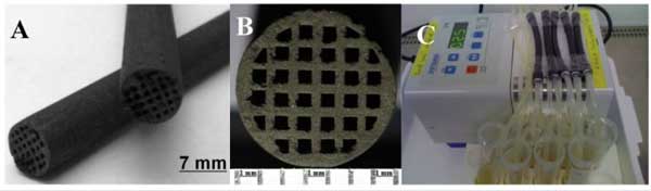 圖2:活性炭整體材料。(A)活性炭的外觀尺寸:長(zhǎng)度10厘米,直徑6.9±0.1毫米;(B)截面幾何尺寸:通道數(shù)量32個(gè),邊長(zhǎng)0.6毫米;壁直徑0.4毫米;(C)用于活性炭整體材料LPS吸附研究的流動(dòng)循環(huán)系統(tǒng)。